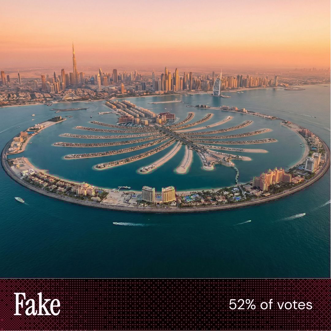 “The building at the end seems completely out of balance but the missing extra arm/pier in the fake picture weight up to that weirdness. Plus the small writing on the buildings in the real photo convinced me this was the real one.” “I think this image was the background on my windows laptop recently.” “Once again, easy. The words on the buildings on [this image] are legible, AI never does this.” |