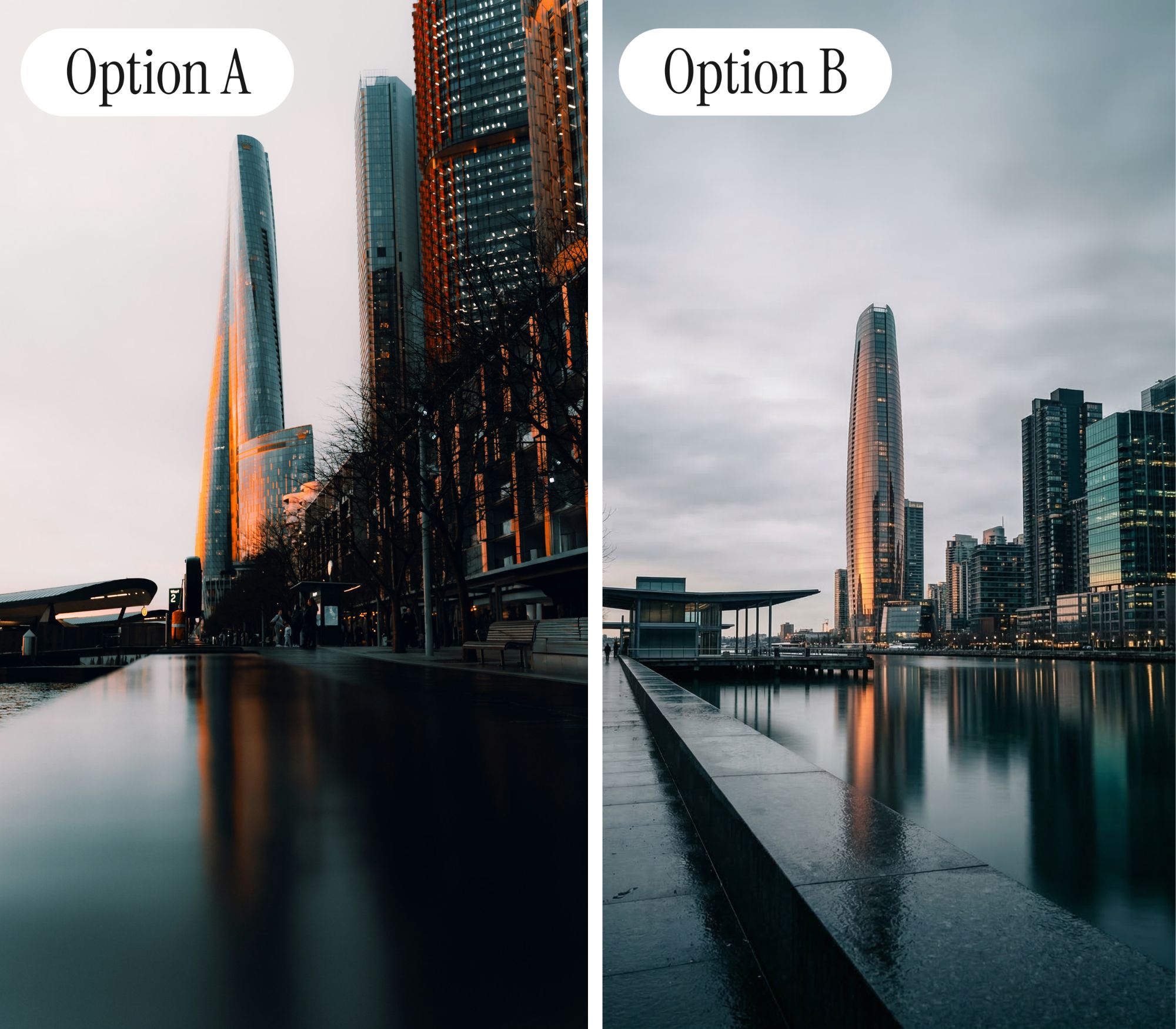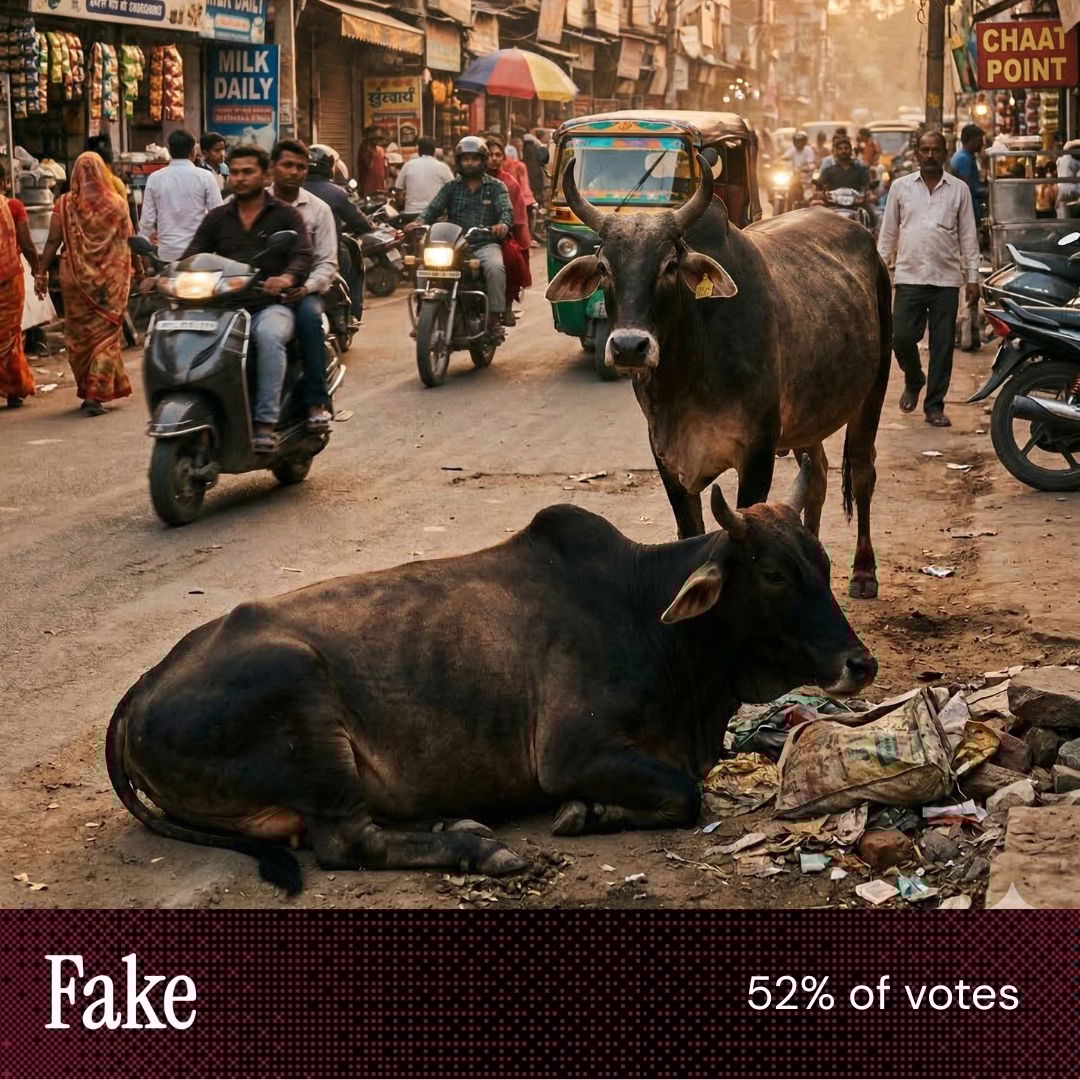“English language signage in [this image] is a giveaway, so too the ideal lighting across foreground, middle ground and background. Also, composition is too staged.” “There's a font choice that AI makes frequently that can be seen on the signs in the background.” “[This image] is the fake image because the motorcycles have the lights on when it is daytime.” |