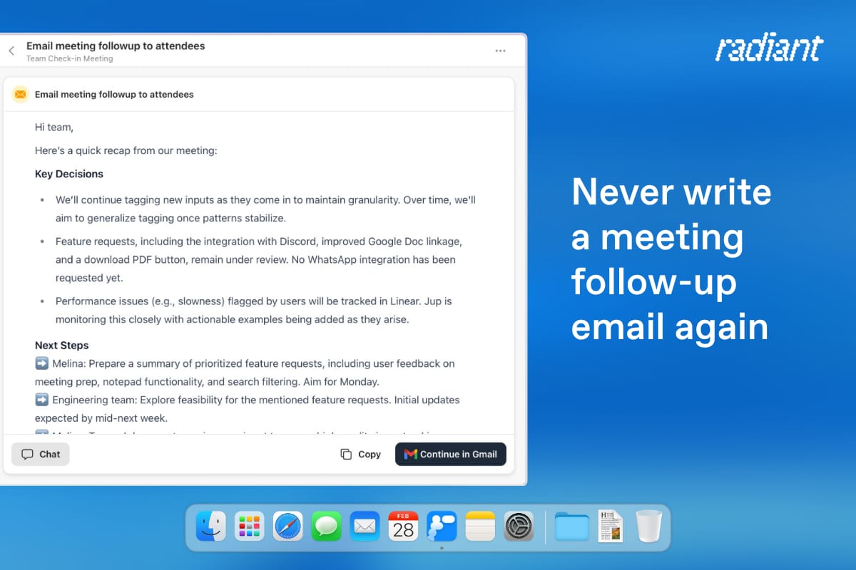 You know the feeling — the meeting ends, and suddenly you’ve got homework. Notes to tidy, action items to assign, emails to draft. Radiant handles all that for you.