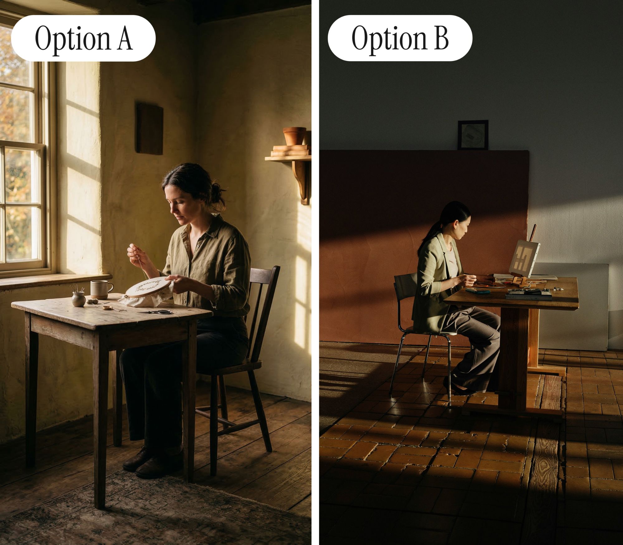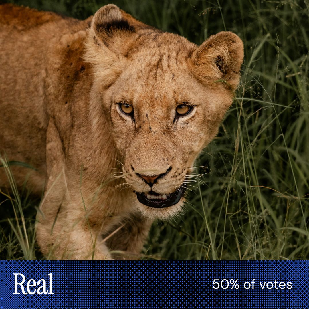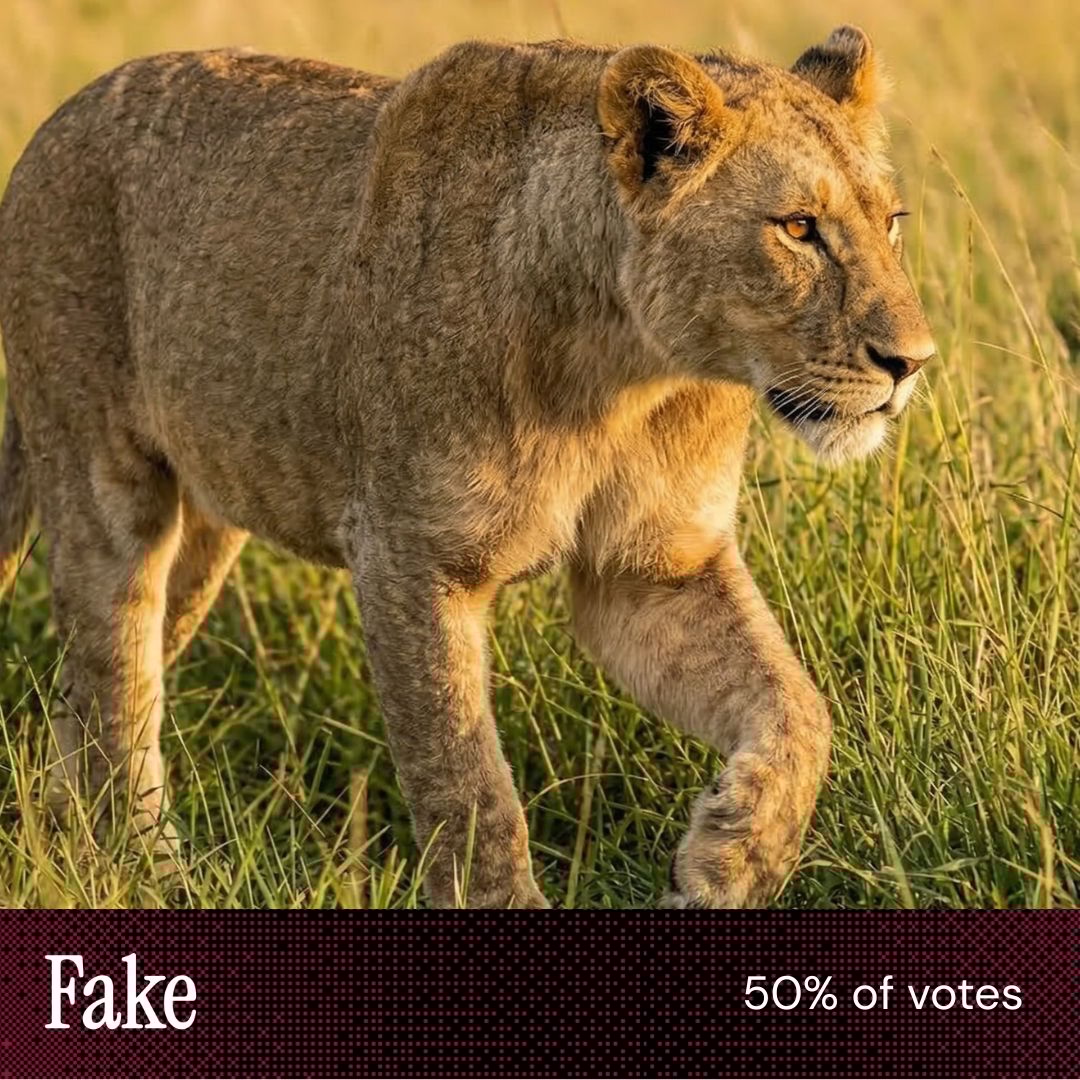 “The left leg in [this image] was bent in an unusual way.” “The grass in [this image] was monoculture, lion’s whiskers perfect, lighting too adjusted.” “Both were plausible but the just perfect cinematic composition and golden hour lighting on [this image], with the slightly soft fur, made me question it.” |
