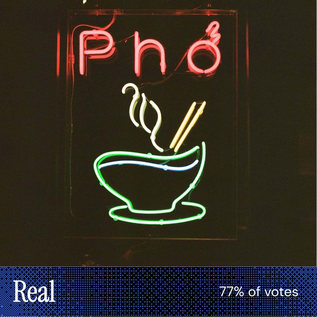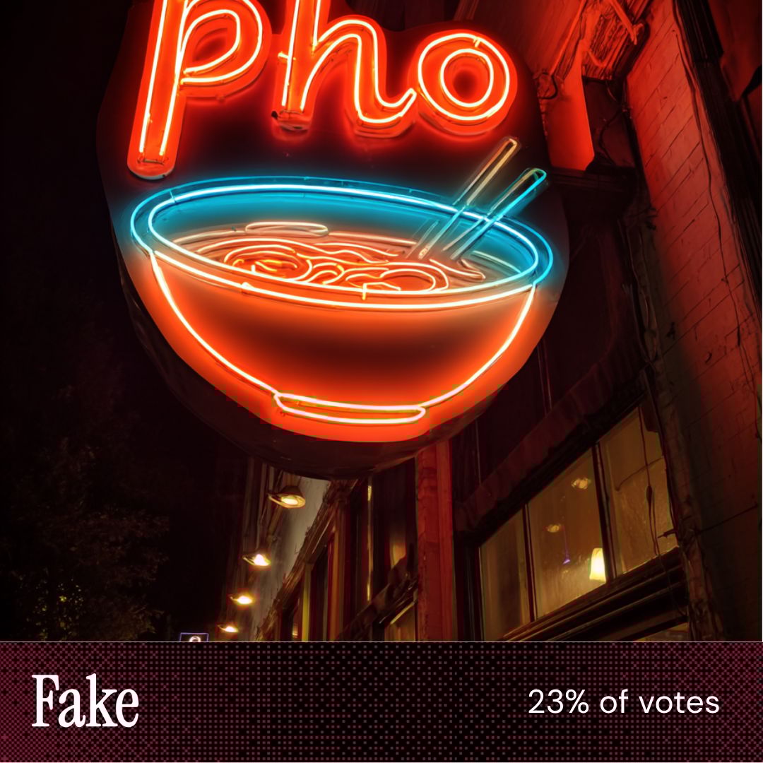 “Most neon bulbs can only have one color. The fake one has bulbs with multiple colors shining out.” “The writing down the street in the fake image "OEHULD&O" makes no sense (especially since the & is upside-down). And sure doesn't look Vietnamese.” “The real image is a bit blurry, lower resolution, so the imperfections tip it into the authentic category. ” |
