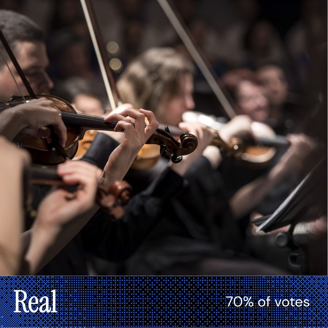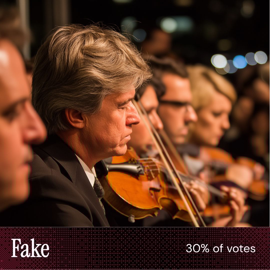 “The guy in the fake one looks off. I can’t explain it, but he just doesn’t look real” “Hands were holding the bows correctly in [this image].” “The fake picture shows the violin floating below the guy's chin. This was an easy pick.” |