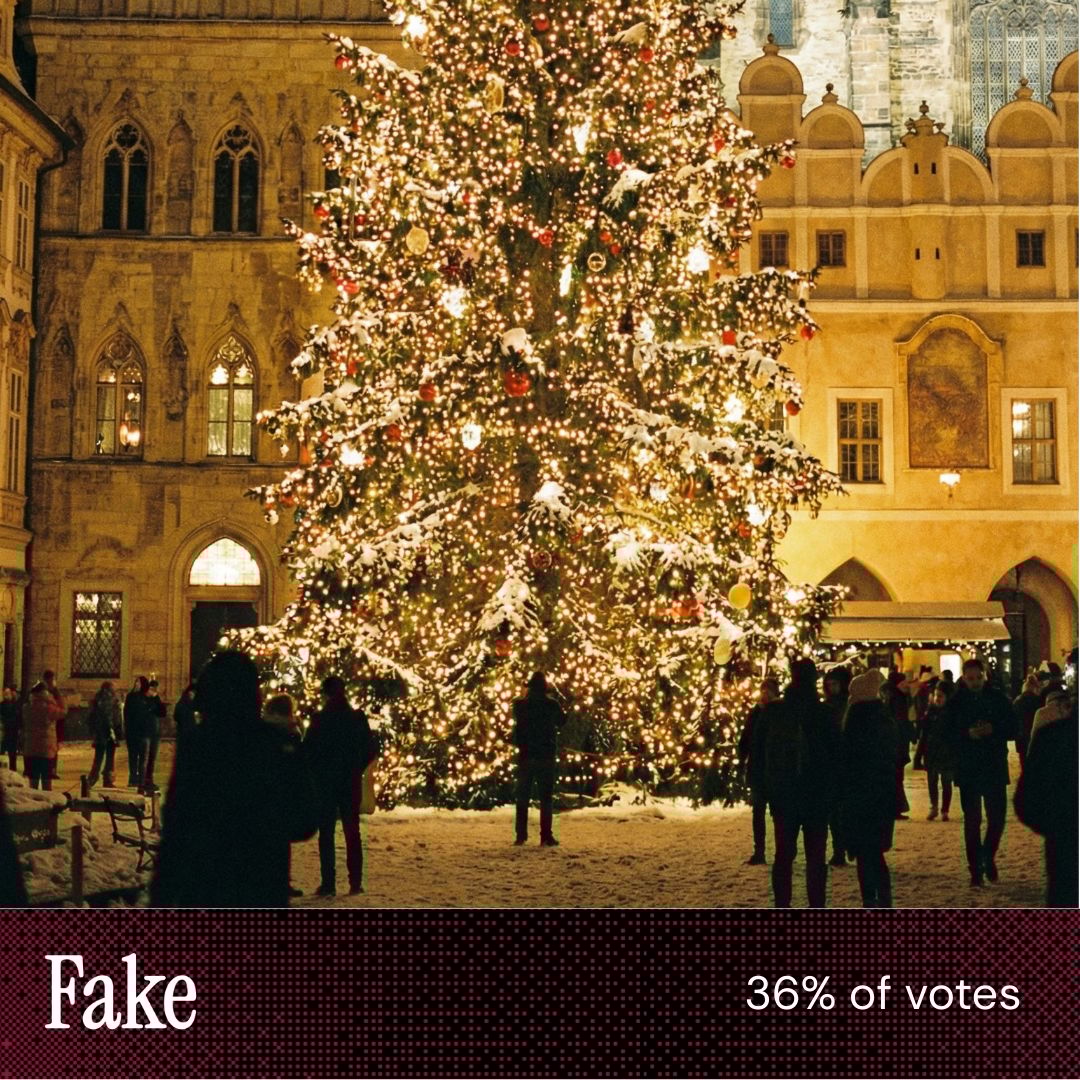 “There’s an awkwardly placed statue on the top of the church in the fake image.” “The tree is only half decorated. AI likes to show a too perfect image, so this had to be the real one.” “Some of the building details and windows didn't align in the fake image, and I thought if there was snow on the roof and on the ground, then snow should also be showing elsewhere.” |